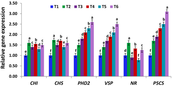 Expression levels of CHI, CHS, PHD2, VSP, NR and P5CS genes in leaves of un-inoculated and inoculated soybean plants with Serratia marcescens BM1 under Cd stress. Data are means ± SE (n = 4). Different letters (a–f) above the chart columns indicate significant differences between treatments (p ≤ 0.05). T1, control with no Cd and BM1 treatment; T2, plant treated with Serratia marcescens BM1; T3, plant treated with 150 µM CdCl2; T4, plant treated with 150 µM CdCl2 and Serratia marcescens BM1; T5, plant treated with 300 µM CdCl2; T6, plant treated with 300 µM CdCl2 and Serratia marcescens BM1.