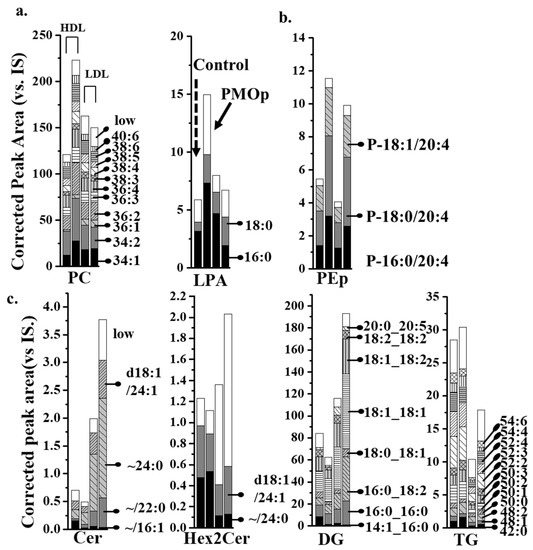 The overall amount of PC and LPA (Figure 4a) showed more than a two-fold increase in the HDL of patients with PMOp, while PEp (Figure 4b) was increased in both HDL and LDL. The four lipid classes (Cer, Hex2Cer, DG, and TG) (Figure 4c) were largely increased in LDL only. High-abundance lipids were defined by a relative abundance > 100%/(total number of lipids within the class). The 12 remaining lipid classes were not significantly different between patients with PMOp and controls (Figure S3). Since the overall amounts of PC and DG were an order of magnitude greater than other lipid classes, their increase in patients with PMOp may be a major contributor to lipid accumulation in HDL and LDL, respectively. Individual lipid species showing more than a 1.5-fold change with p < 0.05 in the PMOp group, either in the HDL or LDL fraction, are plotted in a heatmap representing individual variations (Figure S4).