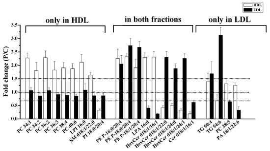 Plot of the fold ratio [PMOp/control (P/C)] of lipid species, showing significant changes (>1.5-fold and p < 0.05) in the HDL or LDL fractions, alone or in both fractions.