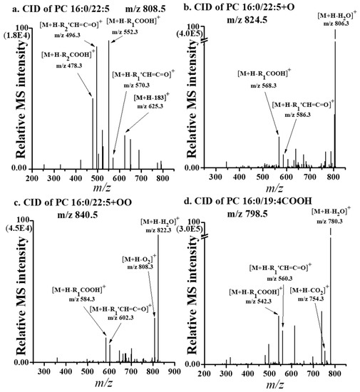 CID spectra of (a) intact PC 16:0/22:5 and oxidized products (b) PC 16:0/22:5 + O, (c) PC 16:0/22:5 + OO, and (d) PC 16:0/19:4COOH.