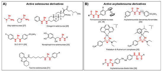 During the implementation of our scientific program based in the synthesis and biological evaluation of Se compounds, we have synthetized and observed the antioxidant and anticancer activity of closely related imidoselenocarbamates [26,27,28,29,30,31,32,33,34], seleno-quinazoline, and pyrido[2,3-d]pyrimidine derivatives [33,35,36,37]. Some evidence has pointed out that relatively simple selenoureas (Figure 1A) might possess a superoxide radical scavenging activity accompanied by a low toxicity in human cells [38]. More recently, selenourea derivatives have presented anticancer and antioxidant properties, such as diosgenin derived selonourea [39], selenourea based carbonic anhydrase (hCA) inhibitor SLC-0111 [40], selenourea mimic of norepinephrine [41], and selenourea linked to tacrine [42]. Acylselenoureas have also been reported (Figure 1B) as hCA inhibitors [43], and are conjugated with ferrocenyl moieties as antiproliferative agents [44,45]. Palladium and ruthenium complexes of acylselenoureas have also been reported as antiproliferative against leukemia cell lines [46]. Our research group also confirmed that acylselenourea derivatives in combination with diselenide motifs present a potent and selective antitumoral activity [47].