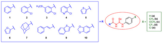 Keeping all this previous experience in mind, in this work, we planned the design of a new library of forty seven acylselenoureas with both a potential anticancer and antioxidant activity following a fragment-based approach for drug design [48], varying the two sides of the molecule, searching for a synergistic effect between the fragments and the acylselenourea itself. In the acyl moiety, we envisioned the introduction of different small carbocyclic and heterocyclic systems able to promote H-bonding, and with a reported antitumor and/or antioxidant activity, such as 2-furyl, 2-thienyl [49], 2-chloronicotinyl, benzo[b]thienyl [50], benzo[d][1,3]dioxolyl [51], and trans-cinnamyl [52]. In the opposite location of the molecule, the substitution in the para position of aniline was encompassed with substituents of a different nature (H, CH3, OCH3, CF3, and Cl), in order to modulate the available electron density on the system. The general structure of the designed compounds is depicted in Figure 2, with carbo- and hetero-cyclic moieties (in blue) and variability on aniline substitution (in green). The proposed synthesis of these compounds was similar to the protocols reported previously for analogous compounds [43,53,54,55].