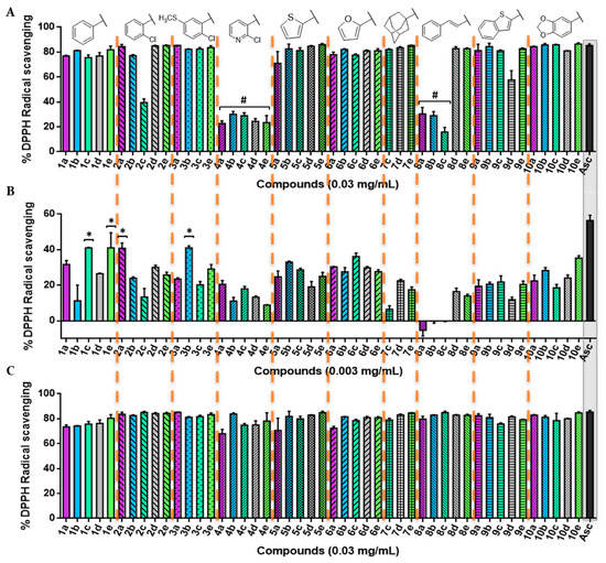 2,2-diphenyl-1-picrylhydrazyl (DPPH) radical scavenging activity of the novel compounds synthetized in this work. (A) Percentage of DPPH• scavenging after 0 min at the highest concentration tested (0.03 mg/mL); (B) percentage of DPPH• scavenging after 0 min at 0.003 mg/mL; (C) percentage of DPPH• scavenging at 0.03 mg/mL after 30 min for all of the 47 compounds. Significance: * p < 0.05 compared with ascorbic acid (Asc). The results obtained for lower concentrations and longer times are included in the Supplementary Material.