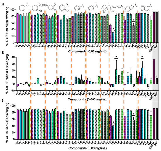 2,2′-azino-bis(3-ethylbenzthiazoline-6-sulfonic acid) (ABTS) radical scavenging activity of the novel acylselenourea compounds. (A) Percentage of ABTS+• scavenging after 0 min at the highest concentration tested (0.03 mg/mL); (B) percentage of ABTS+• scavenging after 0 min at 0.003 mg/mL; (C) percentage of ABTS+• scavenging at 0.03 mg/mL after 6 min of incubation for all the 47 compounds. Significance: * p < 0.05 compare with Asc and Trolox. The results obtained for longer times are included in the Supplementary Material.