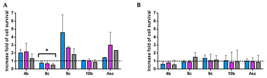 Antioxidant activity of hit compounds at 0.03 mg/mL (A) and 0.003 mg/mL (B) was evaluated using the H2O2-induced HT-29 cells oxidative damage model at 300 (blue), 250 (violet), and 200 µM (grey). The results are expressed as an increase fold of cell survival. Significance: * p < 0.05 compared with Asc.