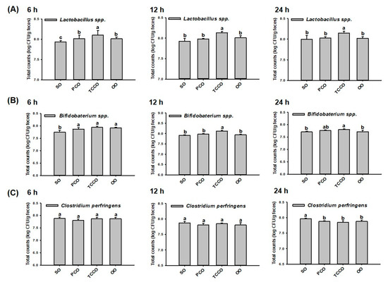 Gut microbiota (A) Lactobacillus spp., (B) Bifidobacterium spp., and (C) Clostridium perfringens in a batch-culture fermentation system containing SO, PCO, TCCO, and OO for in vitro fecal fermentation at 6 h, 12 h, and 24 h. The reported values are expressed as the mean ± standard deviation (SD) (n = 3). Values assigned different letters are significantly different at p < 0.05, which was determined using Duncan’s multiple range test. SO, soybean oil; PCO, camellia oil (Camellia oleifera); TCCO, camellia oil (C. brevistyla); and OO, olive oil.