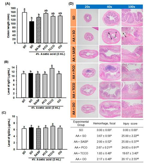 Effects of SO, PCO, TCCO, and OO on (A) colon length, (B) IgG1 levels, (C) IgG2a levels, and (D) hematoxylin and eosin (H&E) staining in Sprague–Dawley rats with AA-induced colitis. The rats received oral administration of SO, PCO, TCCO, or OO for 3 weeks. Then, AA was administered intrarectally for the induction of colitis (except in the normal control group). SASP was used as a positive control after inducing colitis by using AA. The rats were sacrificed on day 3, and their colon tissues were excised. The results are expressed as the mean ± SEM (n = 6). Values assigned different letters are significantly different at p < 0.05, which was determined using Duncan’s multiple range test. SO, 2 mL/kg body weight (BW) of soybean oil; AA, 2 mL of 4% of AA; SASP, 500 mg/kg BW of sulfasalazine; PCO, 2 mL/kg BW of C. oleifera oil; TCCO, 2 mL/kg BW of C. brevistyla oil; and OO, 2 mL/kg BW of olive oil. a, ulceration; b, edema; and c, lost crypts.