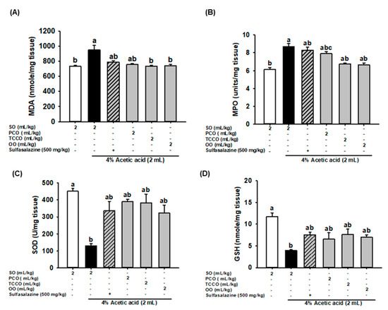 Effects of SO, PCO, TCCO, and OO on the levels of (A) MDA, (B) MPO, (C) SOD, and (D) GSH in the colonic mucosa of Sprague–Dawley rats with AA-induced colitis. The animals received oral administration of SO, PCO, TCCO, or OO for 3 weeks, and then, AA was administered intrarectally for induction of colitis (except in the normal control group). Sulfasalazine (SASP) was used as a positive control after colitis was induced using AA. The rats were sacrificed on day 3, and their colon tissues were excised. The results are expressed as the mean ± SEM (n = 6). Values assigned different letters are significantly different at p < 0.05, which was determined using Duncan’s multiple range test. SO, 2 mL/kg of body weight (BW) of soybean oil; AA, 2 mL of 4% of AA; SASP, 500 mg/kg BW of sulfasalazine; PCO, 2 mL/kg BW of C. oleifera oil; TCCO, 2 mL/kg BW of C. brevistyla oil; and OO, 2 mL/kg BW of olive oil. SOD, superoxide dismutase; MPO, myeloperoxidase; GSH, glutathione; MDA, malondialdehyde.