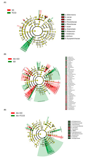 LDA-LEfSe indicated that the TCCO-treated group exhibited a higher relative abundance of Erysipelotrichales and Rikenellaceae than did the SO-treated group. Tao et al. [26] reported that an increase in the counts of Rikenellaceae provides enhanced intestinal protection. In addition, the SO-treated group exhibited a higher relative abundance in Prevotellaceae, and Darnaud et al. [27] showed that DSS-treated REG3A-TG mice (which are less sensitive to colitis) exhibited a lower level of Prevotellaceae than did DSS-treated normal mice. Therefore, higher counts of Prevotellaceae may increase the risk of colitis. Hansen et al. [28] reported that colitis changes the composition of gut microbiota. The AA+SO group had a relatively high abundance of Erysipelotrichaceae and Pasteurellaceae compared with the SO group. Kaakoush [29] indicated that Erysipelotrichaceae is associated with inflammation of the intestine and is highly abundant in patients with colorectal cancer. Glavan et al. [30] reported that an increase in Pasteurellaceae counts is associated with a decrease in the performance of pattern recognition receptors, which are involved in initiating innate immune responses.