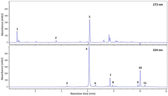 This UHPLC profile of a C. arabica young leaf extract. Absorption profile obtained at 273 and 324 nm using the technical conditions for quantitative analysis. Peak 1 = trigonelline; Peak 2 = theobromine; Peak 3 = 3-caffeoylquinic acid (3-CQA); Peak 4 = 5-caffeoylquinic acid (5-CQA); Peak 5 = caffeine; Peak 6 = 4-caffeoylquinic acid (4-CQA); Peak 7 = mangiferin; Peak 8 = isomangiferin; Peak 9 = 3,4-dicaffeoylquinic acid (3,4 diCQA); Peak 10 = 3,5-dicaffeoylquinic acid (3,5-diCQA); Peak 11 = 4,5-dicaffeoylquinic acid (4,5-diCQA).