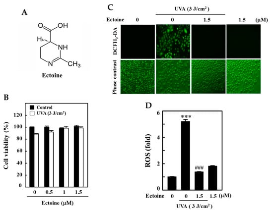 Ectoine inhibits UVA-induced ROS production in human keratinocyte (HaCaT) cells. (A) Ectoine’s chemical structure. (B) To determine cell viability, an MTT assay was used. Cells were treated with Ectoine (0.5, 1, and 1.5 μM) for 24 h. Then, they were irradiated with 3 J/cm2 or without UVA. (C,D) Cells were pre-treated with Ectoine (0 or 1.5 μM) for 24 h and then irradiated with 3 J/cm2 or without UVA. For each condition, we used the percentage of the fluorescence intensity of the DCF-stained cells as determined by Olympus Softimage. Statistical significance was assigned as *** p < 0.001 compared to the untreated control cells and ### p < 0.001 compared to the UVA-exposed HaCaT cells.