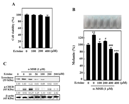 Ectoine downregulated the melanogenesis in α-MSH-stimulated B16F10 cells. (A) High concentrations of Ectoine (100–400 μM, 72 h) affect the cell viability of B16F10 as determined by an MTT assay. (B) Cells were pre-treated with Ectoine (0–400 μM, 1 h) followed by stimulation without or with 1 μM α-MSH for 72 h. The percentage of melanin content was quantified from total cell lysates. (C) Cells were pre-treated with Ectoine (0–200 μM for 1 h) and then treated with or without α-MSH (1 μM) for 24 or 2 h. Western blot analysis measured the expressions of tyrosinase and p-CREB proteins. Statistical significance was assigned as ** p < 0.01; *** p < 0.001 compared to the untreated control cells and # p < 0.05, ### p < 0.001 compared to the α-MSH treated B16F10 cells.
