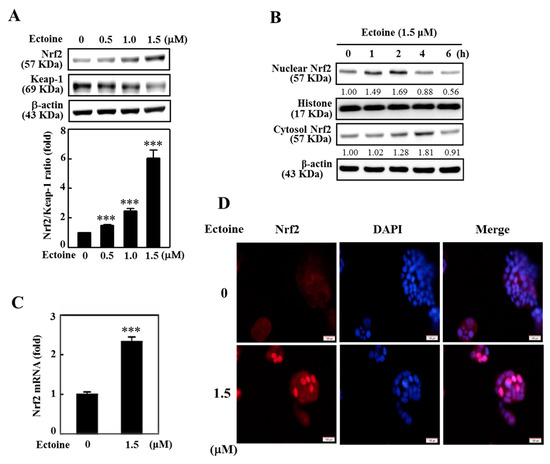 The role of transcription factor Nrf2 in skin cells metabolism was well documented [31]. Therefore, we further tested the mechanisms played by Nrf2/Keap-1 pathway in Ectoine mediated effects in keratinocytes. Figure 4A shows that Ectoine dose-dependently and significantly increased the Nrf2/Keap-1 ratio with a maximum effect was observed at 1.5 µM Ectoine concentration. It was also observed that 1.5 µM Ectoine favored the nuclear translocation of Nrf2 protein with the maximum expression of Nrf2 from the nuclear protein fraction observed at the 2 h time point (Figure 4B). Data obtained from the immunofluorescence staining of HaCaT cells has also supported this effect (Figure 4D).