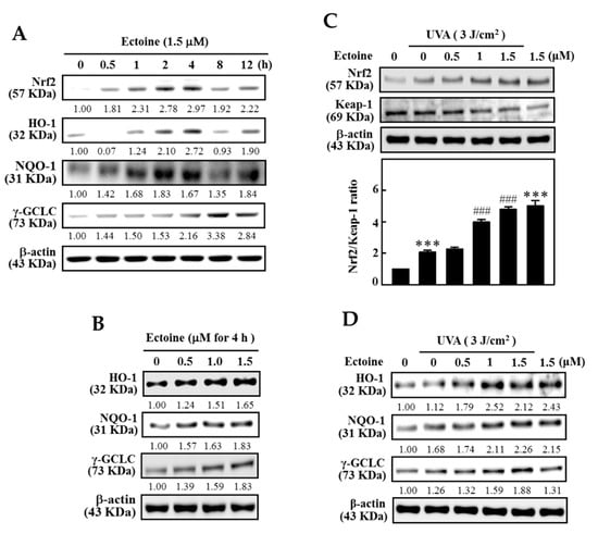 Ectoine mediated differential expressions of antioxidant genes in UVA irradiated HaCaT cells. (A,B) Western blot method was used to determine the effects of time (0–12 h) and Ectoine concentrations (0–1.5 μM) on the expressions of Nrf2 and antioxidant genes (HO-1, NQO-1, and γ-GCLC) in HaCaT cells. (C,D) Effect of Ectoine pretreatment effect on the Nrf2/Keap-1 ratio of HaCaT cells irradiated with UVA. Cells were pre-treated with Ectoine (0–1.5 μM for 24 h), and then irradiated in the absence or presence of 3 J/cm2 UVA. The ratio of Nrf2/Keap-1 (C) and antioxidant gene (HO-1, NQO-1, and γ-GCLC) expressions (D) were determined by Western blotting. Statistical significance was assigned as *** p < 0.001 compared to the untreated cells and ### p < 0.001 compared to the UVA exposed HaCaT cells.