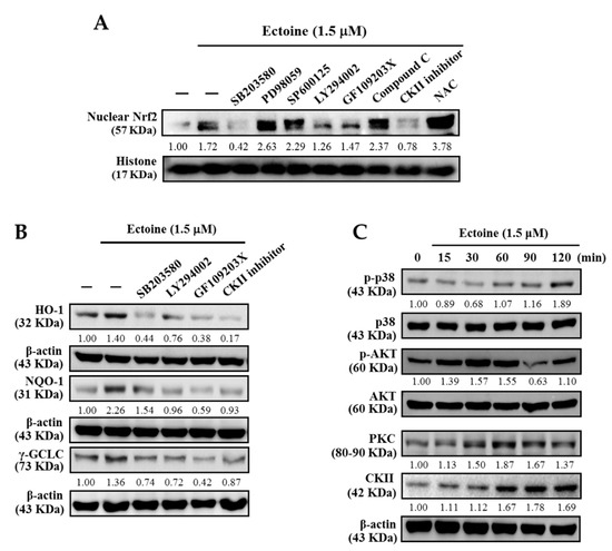 Ectoine mediated the activation of nuclear Nrf2 through p38, AKT, PKC, and CKII signaling pathways in HaCaT cells. (A) Cells were pre-treated with p38 inhibitor (SB203580, 20 μM), ERK inhibitor (PD98059, 30 μM), JNK inhibitor (SP600125, 25 μM), PI3K/AKT inhibitor (LY294002, 30 μM), PKC inhibitor (GF109203X, 2.5 μM), AMPK inhibitor (compound C, 10 μM), Casein kinase II inhibitor (CKII, 20 μM), or antioxidant NAC (1 mM) for 30 min, followed by exposure to Ectoine (1.5 μM) for 2 h. Western blot was performed to analyze the nuclear Nrf2 expression against histone proteins as internal control (B) HO-1, NQO-1, and γ-GCLC protein levels were evaluated using immunoblot analysis. Cells were pre-treated with inhibitors for p38 (SB203580, 20 μM), PI3K/AKT (LY294002, 30 μM), PKC (GF109203X, 2.5 μM), and CKII (20 μM) for 30 min followed by exposure to Ectoine (1.5 μM) for 4–8 h. (C) Ectoine activated the p38, AKT, PKC, and CKII signaling pathways. Cells were pre-treated with Ectoine (1.5 μM) for 0–120 min, and the protein expressions of p-p38, p38, p-AKT, AKT, PKC, and CKII were measured by immunoblot analysis.