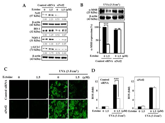 The role of Nrf2 in Ectoine mediated anti-melanogenesis was determined by silencing the Nrf2 in HaCaT cells. Data from the Western blot indicated that Nrf2 knockdown cells exposed to 1.5 μM Ectoine showed minimum expression of NQO-1, HO-1, and γ-GCLC antioxidant proteins (Figure 7A). Later, we tested the effect of Nrf2 knockdown on the expression of α-MSH levels in UVA irradiated (3 J/cm2) HaCaT cells. Western blot results indicated that to control the siRNA transfected cells, UVA-irradiation was significant in the upregulation of the expression of α-MSH levels in cells unexposed to Ectoine (Figure 7B). However, 1.5 μM Ectoine has suppressed this effect. For the other case, cells transfected with siNrf2 showed a decrease in the expression of α-MSH levels in both untreated and treated cells (Figure 7B). Similar to α-MSH data, our fluorescence data also indicated that UVA irradiation significantly upregulated the ROS production in Ectoine untreated control siRNA cells (Figure 7C,D). However, this effect was significantly suppressed when the cells exposed to 1.5 μM Ectoine. On the other hand, Nrf2 transfected and UVA-irradiated HaCaT cells showed an approximately 8-fold increase in ROS levels compared to the Nrf2 transfected cells that were not irradiated with UVA but exposed to Ectoine treatment (Figure 7C,D). All this data signifies the Ectoine mediated protective role played by Nrf2 in the minimization of melanin production in UVA-irradiated HaCaT cells.