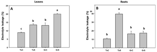 Electrolyte leakage (in %) from foliar (A) and root (B) tissues of two onion genotypes subjected to saline stress for 20 days. Different letters (a,b) indicate significant statistical difference according to Duncan’s Test (p < 0.05). Data represent the mean ± SE of at least four different samples. TxC (‘Texas 502’ control); TxS (‘Texas 502’, salt stressed); GrC (‘Granex 429’ control); GrS (‘Granex 429’, salt stressed).