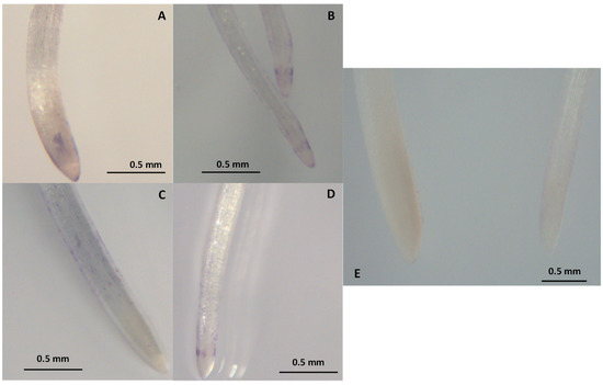 Effect of salt stress on superoxide accumulation in roots from onion plants, detected by histochemical staining with NBT. (A) Control ‘Texas 502’; (B)Salt-treated plants ‘Texas 502’; (C) Control ‘Granex 429’; (D) Salt-treated plants ‘Granex 429’; (E) Roots from salt-treated plants (‘Granex 429’) stained in the presence of 10 mM MnCl2.