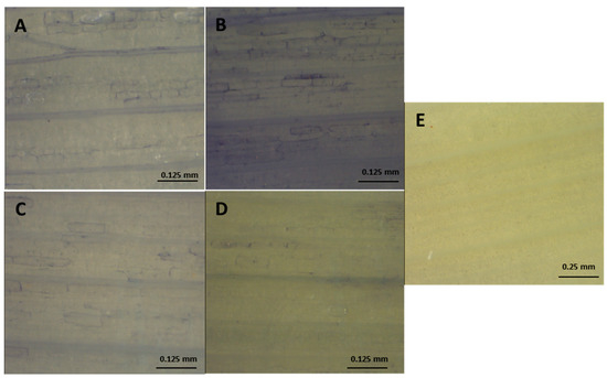The rise in electrolyte leakage was not parallel to ROS accumulation. The staining with NBT revealed an accumulation of O2•− in the leaves and, to a lesser extent, in the roots (Figure 2 and Figure 3). In that regards, the NBT-staining was quite similar in ‘Texas 502’ roots in the absence or in the presence of NaCl. However, in ‘Granex 429’ control roots the NBT-staining was mainly located in the epidermis, while in the presence of salt stress the O2•− accumulation seemed to be located in the root apex (Figure 2). In contrast, the NBT staining was more evident in leaves from onion plants subjected to salt stress, especially in ‘Texas 502’ leaves, that showed a higher O2•− accumulation in the cell walls. The incubation of leaves and roots in the presence of 10 mM MnCl2 prevented the O2•− staining (Figure 2E, Figure 3E.), indicating the specificity of the NBT staining. In this sense, MnCl2 is a highly effective dismutating catalyst agent of O2•− [10]. However, no evident H2O2 accumulation (DAB staining) was observer in either leaves or roots (data not shown).