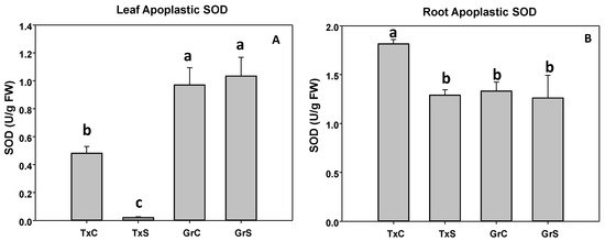 Effect of salinity in the SOD activity in the leaf (A) and root (B) apoplast in two onion genotypes differing in salinity sensibility. Different letters indicate significant statistical difference between treatments according to Duncan’s Test (p < 0.05). Data represent the mean ± SE of at least four different samples. TxC (‘Texas 502’ control); TxS (‘Texas 502’, salt stressed); GrC (‘Granex 429’ control); GrS (‘Granex 429’, salt stressed).
