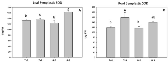 Effect of salinity in the SOD activity in the leaf (A) and root (B) symplast in two onion genotypes differing in salinity sensibility. Different letters (a,b) indicate significant statistical difference between treatments according to Duncan’s Test (p < 0.05). Data represent the mean ± SE of at least four different samples. TxC (‘Texas 502’ control); TxS (‘Texas 502’, salt stressed); GrC (‘Granex 429’ control); GrS (‘Granex 429’, salt stressed).