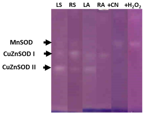 SOD isoenzyme identification after native 10% PAGE in symplast and apoplastic fractions from leaf and roots of onion ‘Texas 502’ plants. LS: Leaf symplast; RS: root symplast; LA, leaf apoplast; RA, root apoplast. + CN, incubation in the presence of 2 mM KCN. +H2O2, incubation in the presence of 5 mM H2O2. For LS and RS 50 µg of protein was used.