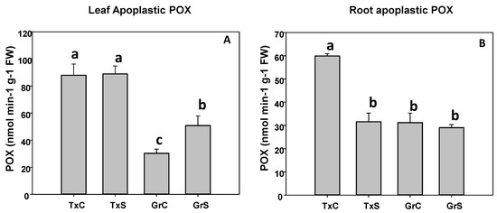 Effect of salinity in the POX activity in the leaf (A) and root (B) apoplast in two onion genotypes differing in salinity sensibility. Different letters (a–c) indicate significant statistical difference between treatments according to Duncan’s Test (p < 0.05). Data represent the mean ± SE of at least four different samples. TxC (Texas 502 control); TxS (Texas 502, salt stressed); GrC (Granex 429 control); GrS (Granex 429, salt stressed).
