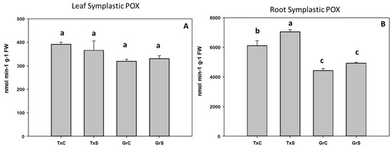 Effect of salinity in the POX activity in the leaf (A) and root (B) symplast in two onion genotypes differing in salinity sensibility. Different letters (a–c) indicate significant statistical difference between treatments according to Duncan’s Test (p < 0.05). Data represent the mean ± SE of at least four different samples. TxC (‘Texas 502’ control); TxS (‘Texas 502’, salt stressed); GrC (‘Granex 429’ control); GrS (‘Granex 429’, salt stressed).