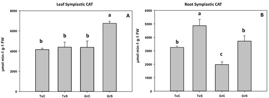 Effect of salinity in the CAT activity in the leaf (A) and root (B) symplast in two onion genotypes differing in salinity sensibility. Different letters (a–c) indicate significant statistical difference between treatments according to Duncan’s Test (p < 0.05). Data represent the mean ± SE of at least four different samples. TxC (‘Texas 502’ control); TxS (‘Texas 502’, salt stressed); GrC (‘Granex 429’ control); GrS (‘Granex 429’, salt stressed).