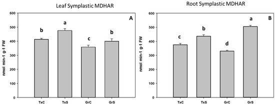 Effect of salinity in the MDHAR activity in the leaf (A) and root (B) symplast in two onion genotypes differing in salinity sensibility. Different letters (a–d) indicate significant statistical difference between treatments according to Duncan’s Test (p < 0.05). Data represent the mean ± SE of at least four different samples. TxC (‘Texas 502’ control); TxS (‘Texas 502’, salt stressed); GrC (‘Granex 429’ control); GrS (‘Granex 429’, salt stressed).