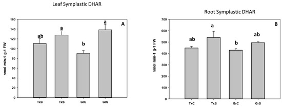 Effect of salinity in the DHAR activity in the leaf (A) and root (B) symplast in two onion genotypes differing in salinity sensibility. Different letters (a,b) indicate significant statistical difference between treatments according to Duncan’s Test (p < 0.05). Data represent the mean ± SE of at least four different samples. TxC (‘Texas 502’ control); TxS (‘Texas 502’, salt stressed); GrC (‘Granex 429’ control); GrS (‘Granex 429’, salt stressed).