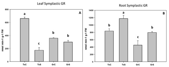 Effect of salinity in the GR activity in the leaf (A) and root (B) symplast in two onion genotypes differing in salinity sensibility. Different letters (a–c) indicate significant statistical difference between treatments according to Duncan’s Test (p < 0.05). Data represent the mean ± SE of at least four different samples. TxC (‘Texas 502 control); TxS (‘Texas 502’, salt stressed); GrC (‘Granex 429’ control); GrS (‘Granex 429’, salt stressed).