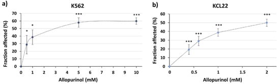 Allopurinol reduces the proliferation of the K562 and KCL22 cells. Cells were treated with different concentrations of allopurinol for 48 h. Proliferation was analyzed by MTT assay. (a) Results show the fraction affected or percentage of inhibition with respect to control in K562 cells (n = 3). (b) Fraction affected or percentage of inhibition with respect to control in KCL22 cells (n = 6). * p < 0.001 and *** p < 0.05 reflect significant differences with respect to control.