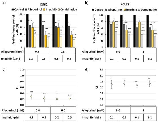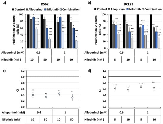 To test this further, the combination of a second-generation BCR-ABL inhibitor, nilotinib, with allopurinol was also tested. In agreement with the results described above, the combination reduced the proliferation more strongly than the individual treatments (Figure 3a,b). Moreover, the analysis of the drug interaction supports the synergism between both drugs, as the CI was below 1 (Figure 3c,d).