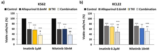 Allopurinol and tyrosine kinase inhibitor (TKI) combination reduces cell number more strongly than single agents. K562 and KCL22 cells were treated with TKIs (imatinib or nilotinib), allopurinol, or their combinations for 48 h. The number of viable cells was counted by trypan blue exclusion. (a) Number of viable K562 cells with respect to control (n = 5). (b) Number of viable KCL22 cells with respect to control (n = 5). Significant differences: *** p < 0.001, ** p < 0.01 with respect to control; ++ p < 0.01 with respect to allopurinol-treated cells; ## p < 0.01, # p < 0.05 with respect to TKI-treated cells.