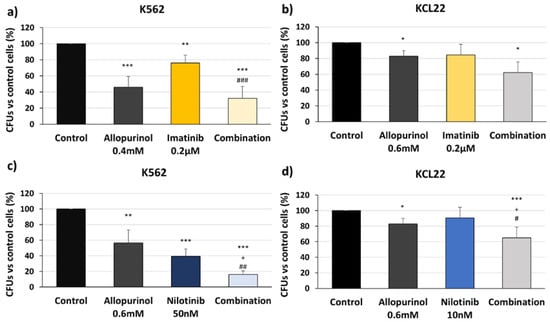 Allopurinol and TKI combination reduces the clonogenic capacity of the K562 and KCL22 cells. K562 and KCL22 cells were treated with TKIs (imatinib or nilotinib), allopurinol, or their combinations for 48 h. The clonogenic capacity after the treatments was analyzed in a semisolid medium by colony-forming unit (CFU) assays. (a) CFU number with respect to control in K562 treated with imatinib, allopurinol or their combination (n = 5). (b) CFU number with respect to control in KCL22 treated with imatinib, allopurinol or their combination (n = 4). (c) CFU number with respect to control in K562 treated with nilotinib, allopurinol or their combination (n = 5). (d) CFU number with respect to control in KCL22 treated with nilotinib, allopurinol or their combination (n = 4). Significant differences: *** p < 0.001, ** p < 0.01, * p < 0.05 with respect to control; + p < 0.05 with respect to allopurinol-treated cells; ## p < 0.01, # p < 0.05 with respect to TKIs-treated cells.
