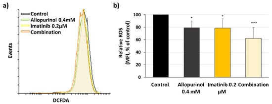 Imatinib, allopurinol, and their combination reduce intracellular reactive oxygen species (ROS) levels. K562 cells were treated with 0.2 μM imatinib, 0.4 mM allopurinol or their combination for 6 h. Intracellular ROS levels were analyzed by flow cytometry staining with 2′,7′-dichlorofluorescein diacetate (DCFDA). (a) A representative flow cytometry histogram is shown. (b) DCFDA mean fluorescence intensity with respect to control reflecting intracellular ROS levels is shown (n = 8). *** p < 0.001, * p < 0.05 reflects significant differences with respect to control.