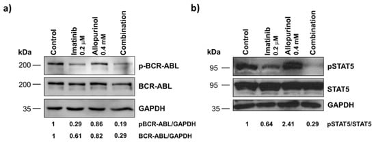The BCR-ABL signaling cascade upon the different treatments was analyzed next. By western blotting, we analyzed the level of activation of BCR-ABL itself, and also the level of activation of STAT5, a direct target of BCR-ABL, and a prominent driver of CML []. Imatinib treatment induced a decrease in both the level of activated BCR-ABL (phosphorylated form) and in the total protein levels (Figure 8a), which was in line with our previous results []. Interestingly, a very similar result was found upon allopurinol treatment (Figure 8a). The combination of both agents showed a significant decrease in the level of both, the activated form of BCR-ABL and in the total levels of the protein. Such a decrease in BCR-ABL could explain the results we have found: the inhibition of proliferation, an increase of cell death and a reduced clonogenic capacity.