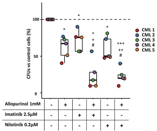 The combination of TKIs and allopurinol reduces the clonogenic capacity of primary chronic myeloid leukemia (CML) cells. BM-MNCs collected from CML patients were treated with TKIs (imatinib and nilotinib), allopurinol, or their combinations for 48 h. The clonogenic capacity after the treatments was analyzed in a semisolid medium by CFU assays. Relative colony numbers of BM-MNCs treated with TKI (imatinib or nilotinib), allopurinol, or their combination are shown. *** p < 0.001, * p < 0.05 with respect to control; ++ p < 0.01, + p < 0.05 with respect allopurinol-treated cells; # p < 0.05 with respect to TKI-treated cells. (n = 5).