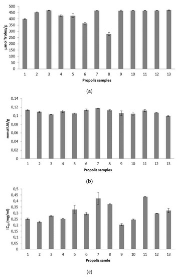Mean values (n = 3) of: (a) Trolox equivalent antioxidant capacity (TEAC) expressed as μmol Trolox/g of propolis, (b) radical-scavenging activity on hydroxyl radicals expressed as mmol uric acid (UA)/g of propolis, and (c) radical-scavenging effect on superoxide radicals expressed as half maximal inhibitory concentration (IC50) (mg/mL). Error bars represent the standard deviation for each data point.