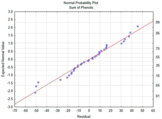 For the ANOVA and multiple regression models, the normality of residuals was verified. To check this assumption, normal probability plots of the residuals were plotted for each compound. The graph for the sum of polyphenols is shown in Figure 1. The results of the ANOVA test and the linear regression models are shown in Table 3. The temperature was mainly responsible for the polyphenols depletion and there were no significant effects from time or the interaction. These results are in accordance with those reported by Goulas et al. (2015), who showed that heating the oil at 180 °C for 1 h or for 5 h made no difference in polyphenol content decrease [].