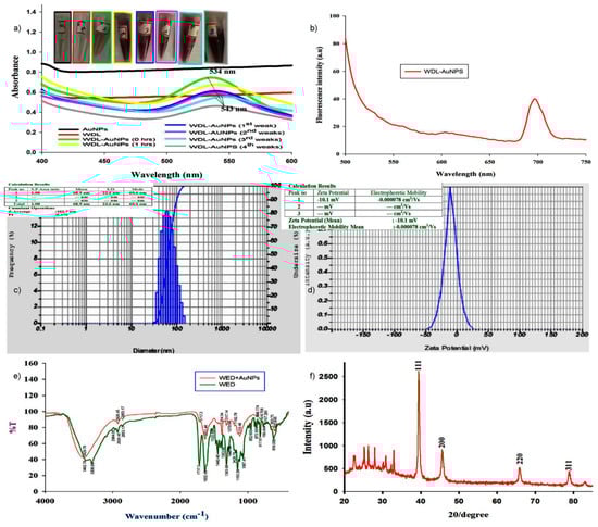 (a) Surface plasmon resonance of wedelolactone-gold nanoparticles (WDL-AuNPs) synthesized by WDL upon reduction of AuCl4 observed by UV–Vis spectroscopy. (b) Emission spectra of AuNPs. (c,d) DLS and Zeta potential analysis of synthesized WDL-AuNPs. Mean size distribution of WDL-AuNPs was found to be 102.7 nm. WDL-AuNPs slightly increased the negative surface charge from –10.1 mV. (e) FT-IR absorption spectra of pure WDL and WDL-functionalized AuNPs. (f) XRD patterns of the WDL-functionalized AuNPs. The XRD pattern was obtained according to four planar angles ranging from 20 to 80 at 20 peak values of 38.43°, 45.66°, 65.80°, and 78.76°, respectively, of 111, 200, 220, and 311 planes for gold.