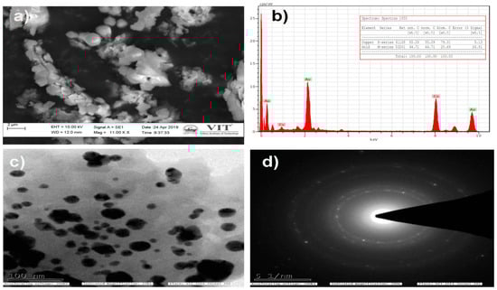 (a) Scanning electron microscope (SEM) and (b) Energy-dispersive X-ray (EDX) profile of WDL-AuNPs. (c) Transmission electron microscope (TEM) micrograph of the 1 mM AuCl4− ions with WDL showing synthesized AuNPs. Purified NPs from WDL were examined by electron microscopy. The range of observed diameters of the synthesized AuNPs was about 20 to 50 nm. (d) Selected area diffraction (SAED) pattern.