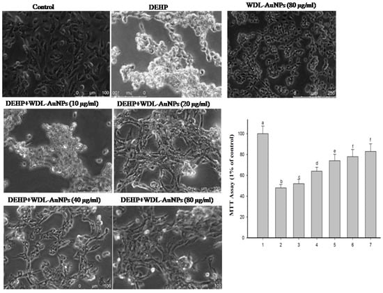 Effect of WDL-AuNPs on cell viability in DEHP-induced RIN-5F pancreatic β-cells. (1) Normal RIN-5F cells, (2) DEHP (625 µM), (3) DEHP + WDL-AuNPs (10 µg/mL), (4) DEHP + WDL-AuNPs (20 µg/mL), (5) DEHP + WDL-AuNPs (40 µg/mL), (6) DEHP + WDL-AuNPs (80 µg/mL), (7) WDL-AuNPs (80 µg/mL). Values were mentioned as mean ± SD for all the three experiments in every group. The values which do not share a common letter (a–f) are predominantly significant in difference over the groups (p < 0.05).