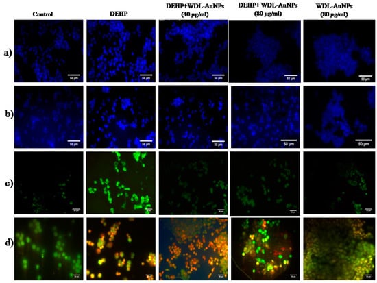 Effect of WDL-AuNPs on DEHP-induced apoptotic features in RIN-5F cells. (a) DAPI stain, (b) Hoechst 33342, (c) ROS, (d) AO/EB stain.