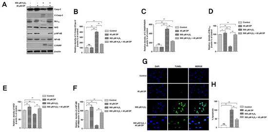 Delphinidin protects C28/I2 chondrocyte cells from H2O2-induced oxidative stress via nuclear factor (erythroid-derived 2)-like 2 (Nrf2) and nuclear factor kappa B (NF-κB). (A) The C28/I2 chondrocyte cells were treated with 500 µM H2O2 in presence or absence of 40 µM delphinidin (DP) for 4 h. After cell lysis, total cell extracts (30 µg) were separated on 8% or 10% SDS-PAGE and analyzed by Western blotting using primary antibodies against proteins (Bcl-XL, caspase-3, cleaved caspase-3, Nrf2, NF-κB, p-NF-κB, and cleaved poly(ADP-ribose) polymerase N-acetylcysteine (PARP)). β-Actin was used as a loading control. (B–F) The relative amounts of caspase-3/leaved caspase-3, cleaved PARP, Bcl-XL, Nrf2, NF-κB, and p-NF-κB, respectively, shown in Western blot analyses, were quantified by NIH ImageJ software and represented as a graph. Data represent the means (± SD) of three independent experiments (** p < 0.01, * p < 0.05; ns indicates not significant). (G–H) The C28/I2 chondrocyte cells were treated with 500 µM H2O2 in the presence or absence of 40 µM delphinidin (DP) for 4 h. A terminal uridine nick-end labeling (TUNEL) assay was preformed after according to the instructions of the Promega DeadEnd™ Fluorometric TUNEL system kit. The images were captured using a florescence microscope (BX51-DSU; Olympus, Tokyo). Data represent the means (± SD) of three independent experiments (** p < 0.01; ns indicates not significant).