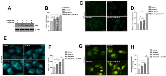 To further test the cytoprotective activity of delphinidin, we measured autophagy induced by treatment with H2O2 in the presence and absence of delphinidin for 4 h. Firstly, we assessed the conjugation of LC3 (unconjugated LC3, called LC3-I) with PE (phosphatidylethanolamine) lipids, called LC3-II. Interestingly, expression levels of well-known autophagy marker LC3-II were significantly increased in the group treated with delphinidin only and in groups treated with H2O2 in the absence or presence of delphinidin (Figure 3A,B). These data were further confirmed by LC3 punctate analysis, as well as MDC and acridine orange (AO) staining analyses, which are indicative for the formation of autophagosomes or autolysosomes upon induction of autophagy. Once LC3s are conjugated with PE, they aggregate together into an intracellular double-membrane structure, called autophagosomes, and subsequently into autolysosomes fused with lysosomes. As shown above, delphinidin itself significantly increased LC3 puncta and further promoted these punctate numbers when chondrocytes were incubated with 40 µM delphinidin and 500 µM H2O2 (Figure 3C,D). In addition, MDC or AO dye staining analyses showed a similar formation of autolysosomes with treatment of delphinidin and hydrogen peroxide (Figure 3E–H). These results indicate that autophagy induced by delphinidin could be associated with the cytoprotective mechanism in chondrocytes in oxidative stress conditions.
