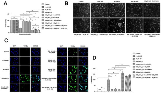 Inhibition of delphinidin-induced autophagy increases H2O2-induced apoptosis in C28/I2 chondrocyte cells. (A,B) The C28/I2 chondrocyte cells were treated with 500 µM H2O2 in the presence or absence of 40 µM delphinidin (DP), 100 nM rapamycin (Rapa), and 20 µM chloroquine (CQ) for 4 h. Cell viability was determined by the CCK-8 assay. Data represent the means (± SD) of three independent experiments (** p < 0.01, * p < 0.05; ns indicates not significant). Treated cell images were analyzed for cell morphology (100× magnification) using bright-field microscopy at 2 h (ns indicates not significant; scale bar = 10 µm). (C,D) The C28/I2 chondrocyte cells were treated with 500 µM H2O2 in the presence or absence of 40 µM delphinidin (DP), 100 nM rapamycin (Rapa), and 20 µM chloroquine (CQ) for 4 h. TUNEL assays were preformed after according to instructions of the Promega DeadEnd™ Fluorometric TUNEL system kit. The images were captured using a florescence microscope (BX51-DSU; Olympus, Tokyo). Data represent the means (± SD) of three independent experiments (** p < 0.01; ns indicates not significant).