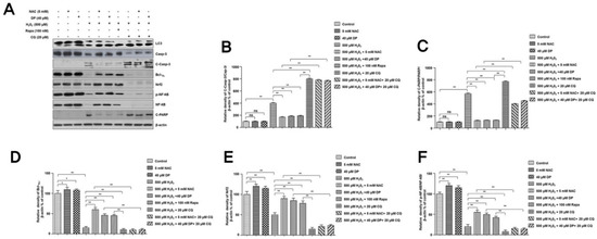 We also investigated the effect of autophagy in cell protection using the TUNEL assay. As expected, the percentage of apoptosis of TUNEL-positive cells treated with H2O2 in the presence of NAC was significantly decreased. Furthermore, delphinidin and autophagy activator rapamycin also significantly decreased the percentage of apoptosis compared to treatment with H2O2 only. However, the percentage of apoptosis in cells treated with H2O2 in the presence of autophagy inhibitor chloroquine, regardless of NAC or delphinidin, was significantly increased compared to that of cells treated with H2O2 only. These results further suggest the cytoprotective role of autophagy (Figure 4C,D). To investigate the cytoprotective role of autophagy activation involved in the effect of delphinidin against oxidative stress, we performed Western blot analysis for autophagy marker LC3, apoptosis markers c-caspase-3 and c-PARP, antiapoptotic marker Bcl-XL, and antioxidant response proteins (Nrf2 and p-NF-κB) (Figure 5A–F). Interestingly, levels of apoptosis markers such as c-caspase-3 and c-PARP were significantly decreased after treatment with H2O2 in the presence of NAC, delphinidin, or rapamycin compared to those in the group treated with H2O2 only (Figure 5A–C). On the other hand, levels of antiapoptotic protein (Bcl-XL) and antioxidant response proteins (Nrf2 and p-NF-κB) were significantly increased after treatment with H2O2 in the presence of NAC, delphinidin, or rapamycin compared to those in the group treated with H2O2 only (Figure 5A,D–F). However, inhibition of autophagy with CQ significantly increased the apoptosis of these cells in the group treated with H2O2 only or in the presence of NAC and delphinidin (Figure 5A–C), but significantly decreased levels of antiapoptotic protein Bcl-XL and antioxidant response proteins (Nrf2 and p-NF-κB) (Figure 5A,D–F). These results clearly demonstrate that delphinidin can activate autophagy, which has a significant role in protecting humane chondrocytes against oxidative stress.