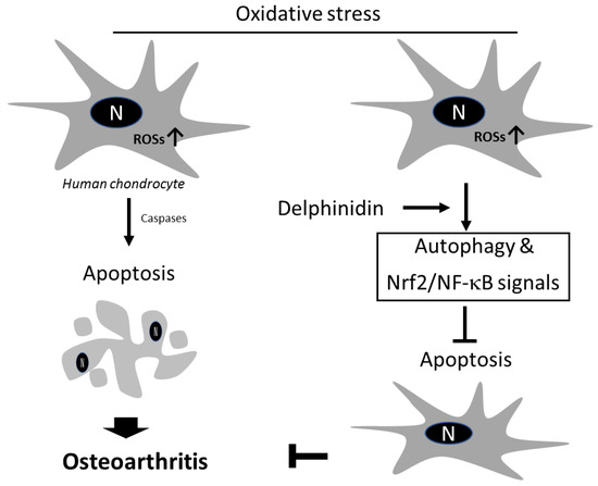 In this study, we evaluated the potential role of delphinidin in protecting human chondrocytes against hydrogen peroxide (H2O2)-induced oxidative stress. Furthermore, we investigated which mechanism might be associated with delphinidin-induced cell protection in human chondrocytes. Cell survival is generally associated with apoptosis or autophagy. However, we do not yet know which pathway delphinidin uses to prevent the progression of OA. Thus, the purpose of this study was to investigate whether delphinidin might be cytoprotective for human chondrocytes and to further elucidate mechanisms associated with the effect of delphinidin. We hypothesized that delphinidin could prevent the progression of OA via autophagy.